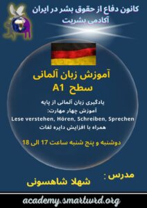 Bashariyat Academy-Defense of Human Rights Association in Iran holds: A1 German Language Teacher: Ms. Shahla Shahsavani Learning German Language from Basic Education of 4 Skills of German Language with Expanding on Vocabulary Date: Monday and Thursday – 17:00-18:00 to Central European Time