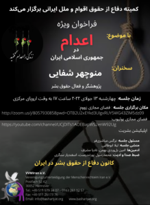 Defense of Iranian Ethnics and Nations Rights Committee holds Speech, Discussion, Question and Answer Speakers and Topics: Zahra Rahaei: The Iranian Ethnics and Nations rights violation report and analysis in the Khordad 1401 Leila Aboutalebi: Examining the International Convention on the Elimination of All Forms of Racial Discrimination (Article 2) and its Comparison with the …