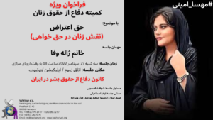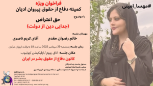 Defense of the Rights of the Followers of Religions Committee holds Speech, Discussion, Question and Answer Speakers and Topics: Sharareh Hadizadeh Raeisi: Religions Followers Rights Violation report and analysis in the Shahrivar 1401 Leyla Ramezan: Examining the Elimination of All Forms of Intolerance and of Discrimination Based on Religion or Belief and its Comparison with …