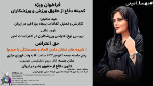 The Defense of the Rights of Sport and Athletes Committee holds Speech, Discussion, Question and Answer Speakers and Topics: Sepehr Rezaei Shayan: Athletes Rights Violation Report and analysis in the Mehr 1401 Zahra Rahaei: Examining the Convention against Torture and Other Cruel, Inhuman or Degrading Treatment or Punishment and its Comparison with the Islamic Republic …