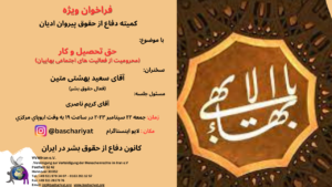 The Defense of the Rights of Iranian Ethnics and Nations Committee Twitter Live Meeting was held on August 28, 2023 at 19:00 to Central European Time on Twitter, with administration of Karim Naseri, Guest: Ghazalehalsadat Abtahi with Subject of Elegy for Shoulder Carriers. with participation of Karim Naseri, Reza Shaighan, Ghazalehalsadat Abtahi. Meeting Responsible: Karim …