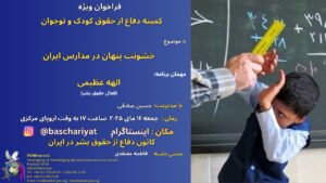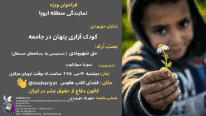 The Defense of Child and Adolescent Rights Committee Special Meeting was held on April 24, 2025 at 17:00 to Central European Time with administration of Aylin Aliverdilouei on Zoom. Lecturers and their lecture subjects are: 1- Start of the meeting with administration of Aylin Aliverdilouei, 2- Fatemeh Shadid: Fastening of Children, 3- Fatemeh Motaghedi: Mutilation …