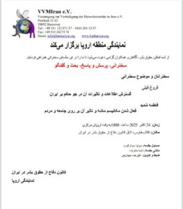 Europe Region Representation Special Meeting was held on October 24, 2025 at 18:00 to Central European Time, with administration of Sonia Savarkoob, on Clubhouse. Guest: Forough Fili: Spreading of Information and its Impact on the Dominant Atmosphere on Iran, Fatemeh Shadid: Activation of Trigger Mechanism and its Impact on Society and People. Responsible of Meeting: …