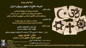 The Defense of the Rights of Iranian Ethnics and Nations and the Defense of the Rights of Child and Adolescent Committee Speech, Discussion, Question and Answer Speakers and Topics: Hosein Amjadi: Examining the 3rd Article of Universal Declaration pf Human Rights, and its Comparison with the Islamic Republic of Iran Constitution Manijhe Dashti: The Convention …