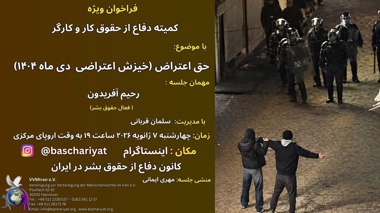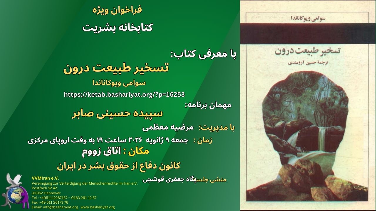 Lecturers and their lecture subjects are: 1- Shahrzad Haghverdi: Human Rights Violation Report and analysis in the Azar 1404, 2- Manijhe Dashti: Examining the 14th Goal of UNESCO`s 2030 Agenda, and its Comparison with the Islamic Republic of Iran Constitution, 3- Shayan Haghverdi: Future of Society in Iran, 4- Farideh Shami Golsheykh: Book Introduction, 5- Free Discussion: Don’t Forget Our Right (Right to Freedom of Expressing the Opinion), with participation of: Amir Palvaneh, Farjoud Taghipour, Nadia Mosharraf, Hossein Sadeghi, Mehrnoosh Roham, Manijhe Dashti, Mohammad Mashali, Mahmood Golestani, Hamidreza Pirani, Sepideh Hoseini Saber, Rahim Afaridoun.